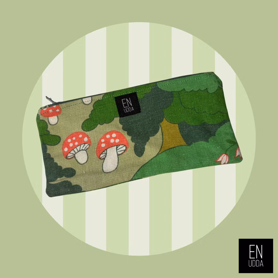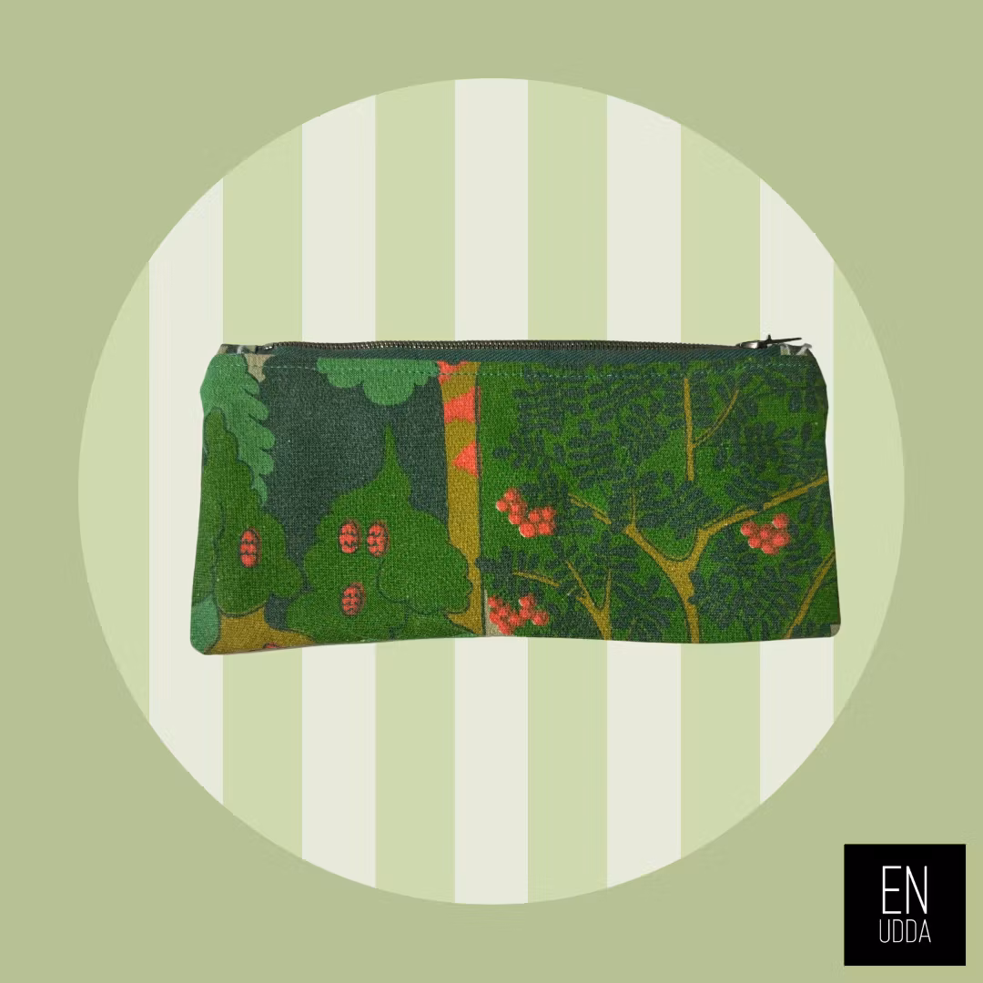 Tillverkad av återbrukat material. Yttertyg är i det ljuvliga tyget "SKOGEN" designad av Ulla Eson Bodin.