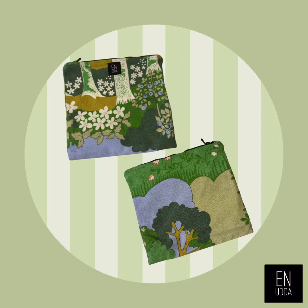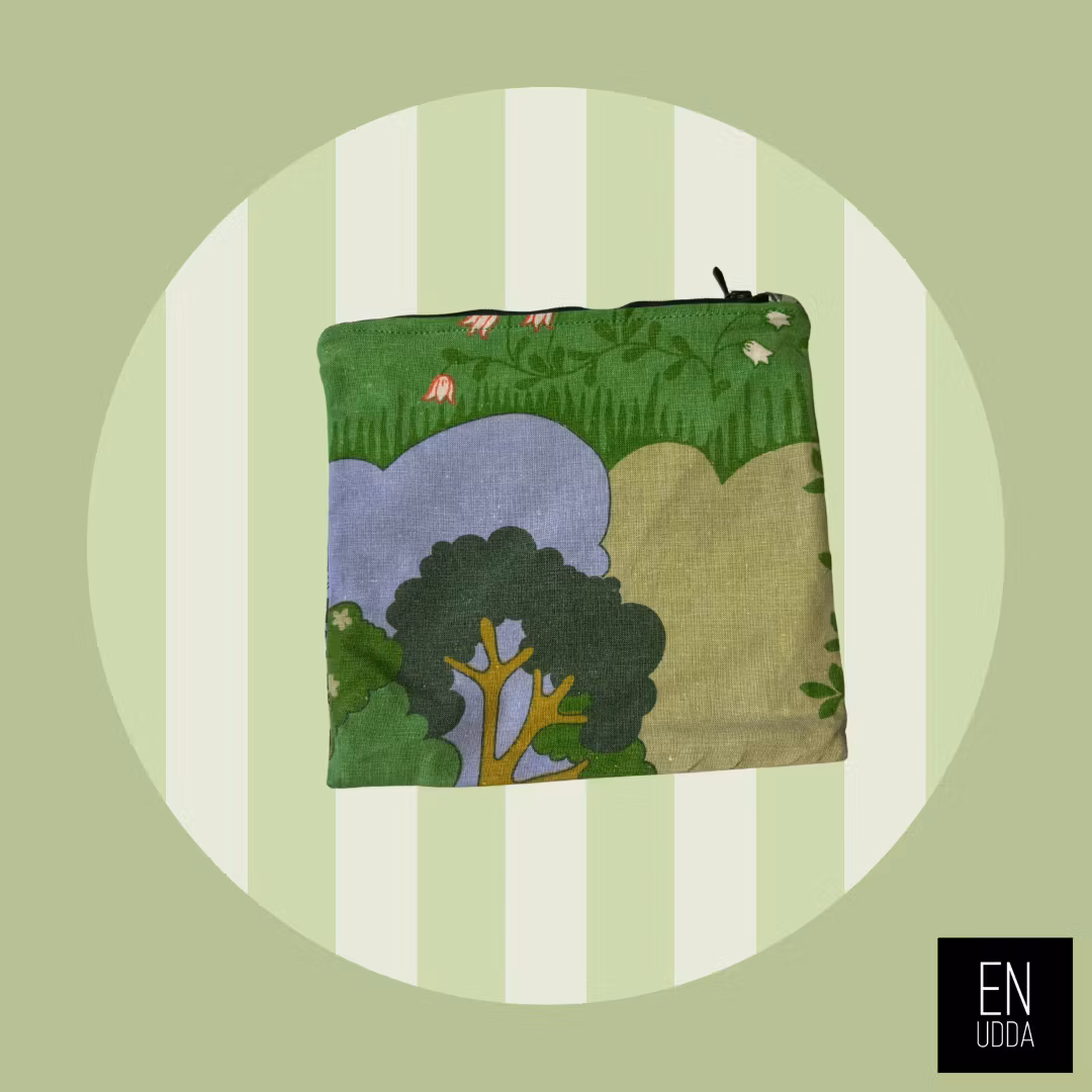 Tillverkad av återbrukat material. Yttertyg är i det ljuvliga tyget "SKOGEN" designad av Ulla Eson Bodin.