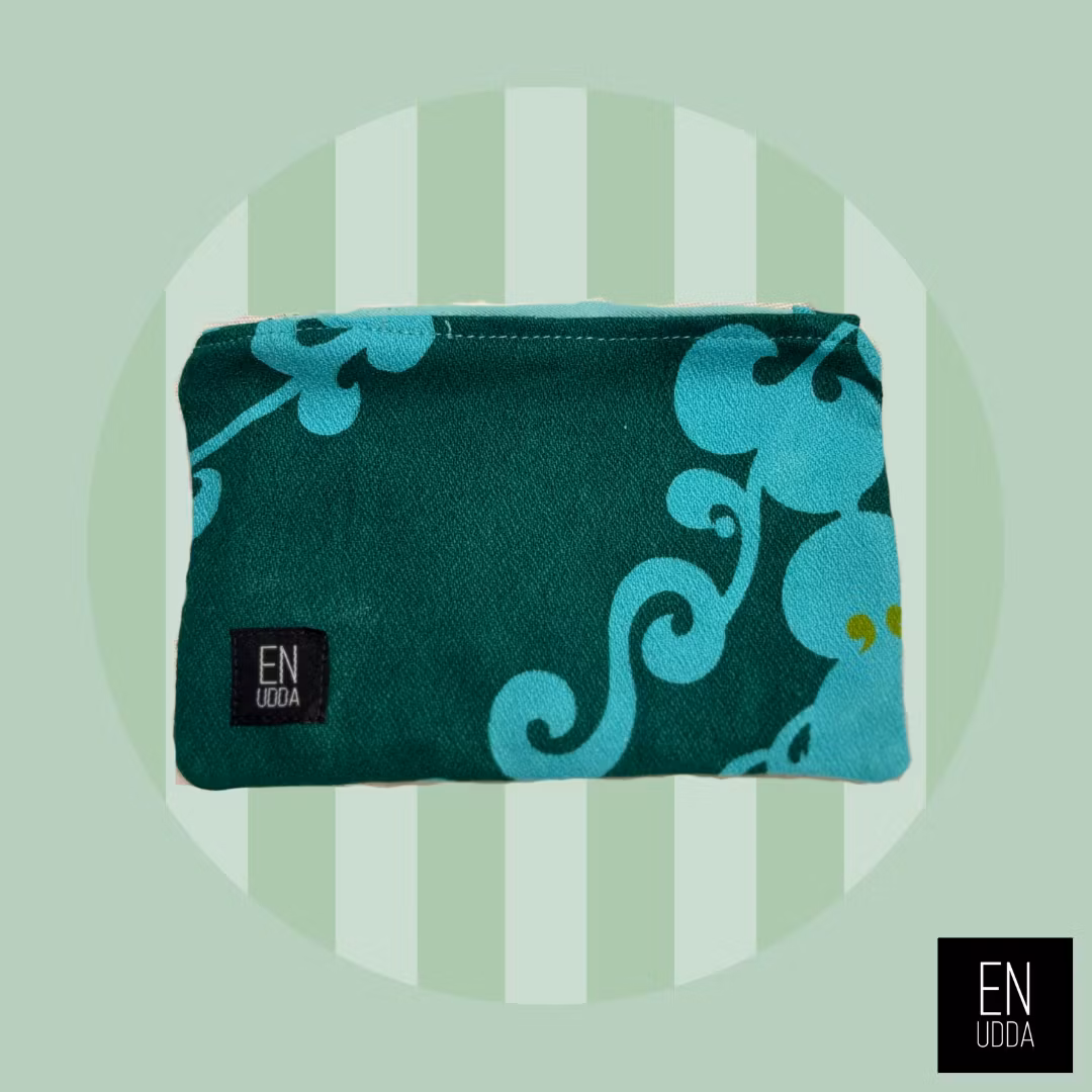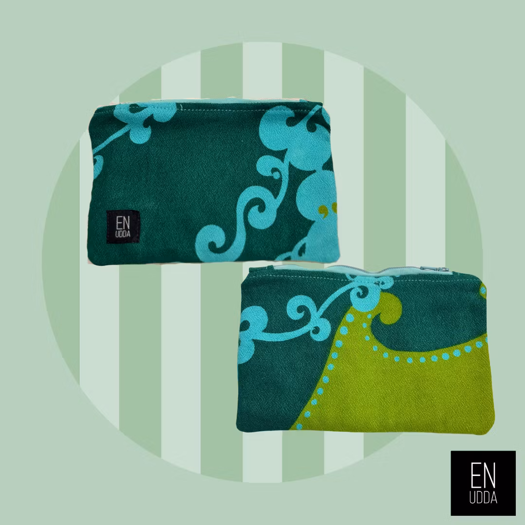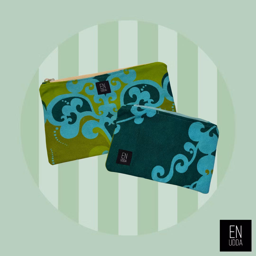 Tillverkad av återbrukat coolt retrotyg i turkos och gröna toner. Bild visar fram och baksida. Fodrad med vit och blårandigt innertyg.