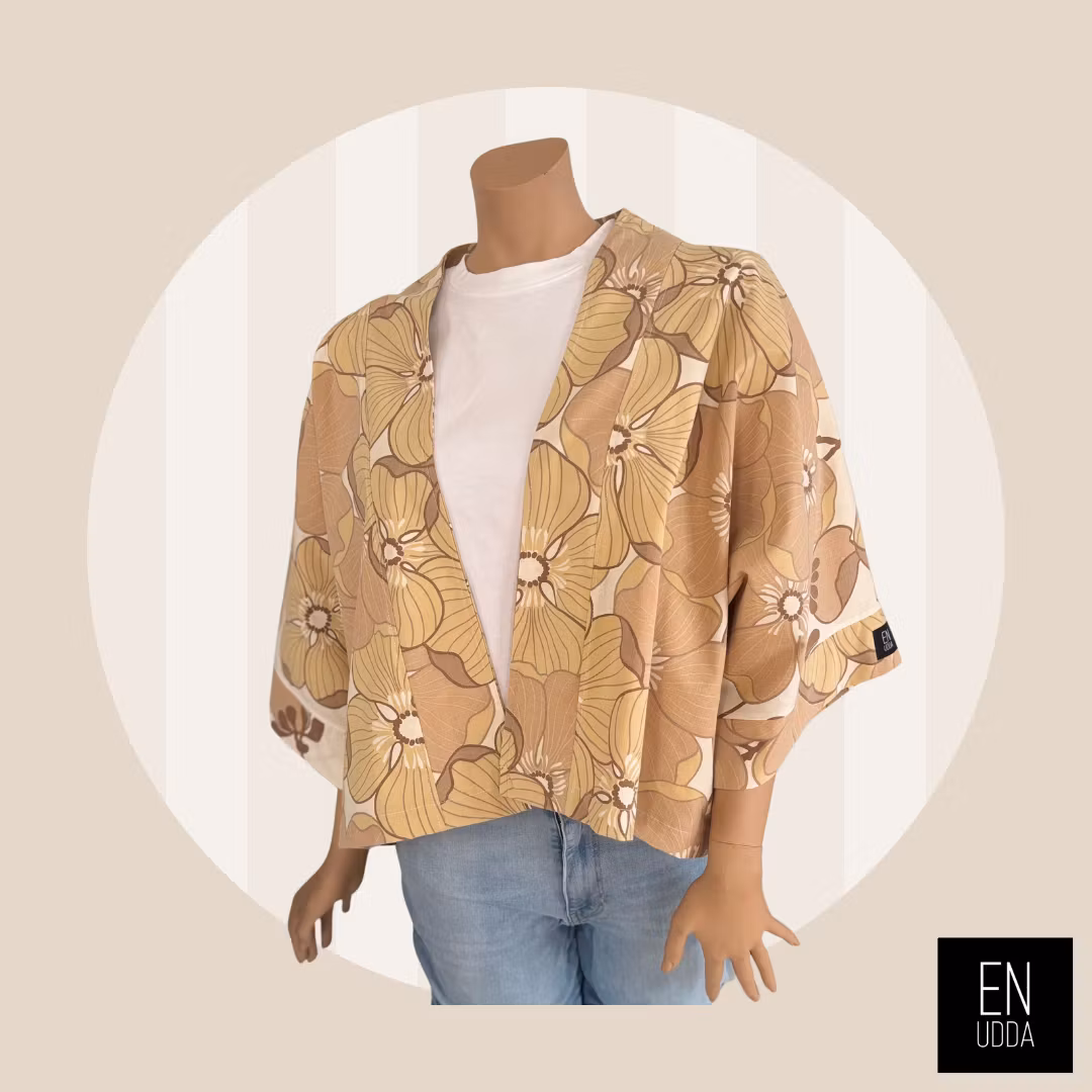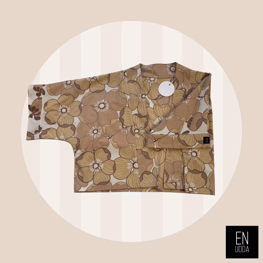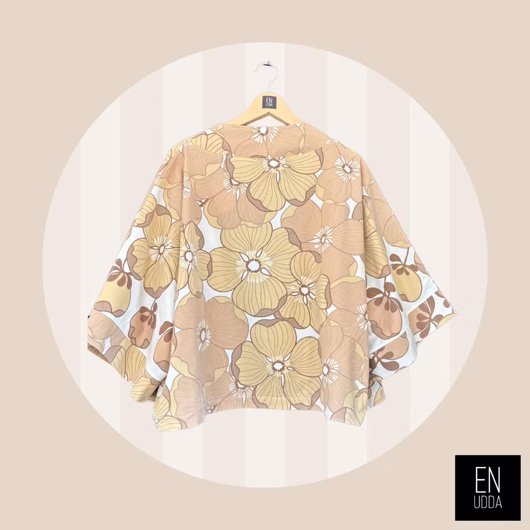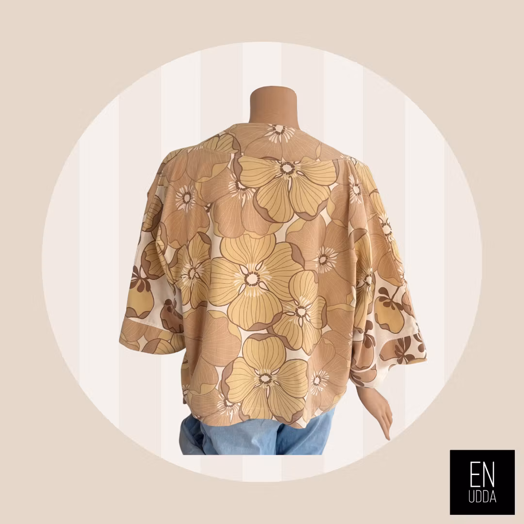 Denna är sydd i ett härligt storblommigt retrotyg i beigea toner. En gång i tiden så har detta tyg varit påslakan och det gör sig så snyggt till detta plagg.