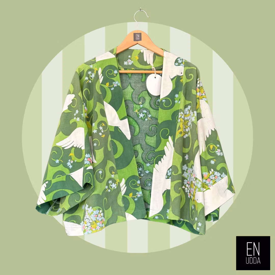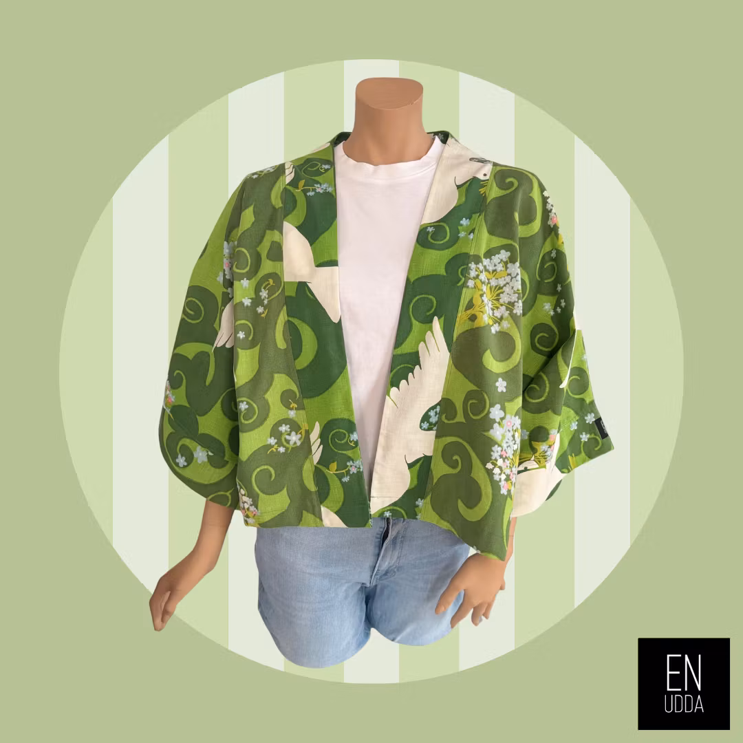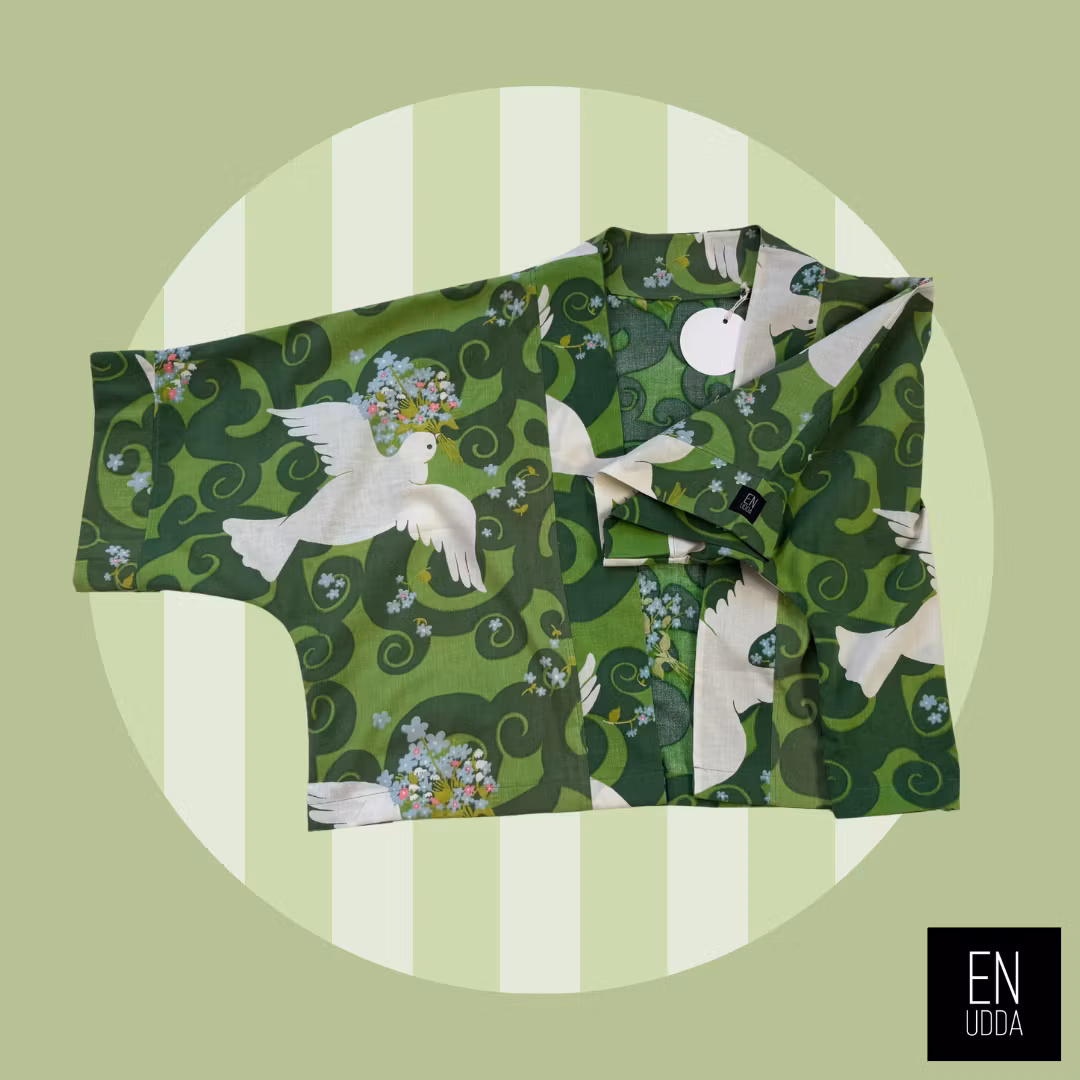Denna är sydd i ett härligt grönt retrotyg med fredsduvor. En gång i tiden så har detta tyg varit påslakan och det gör sig så snyggt till detta plagg. Ett plagg som syns.
