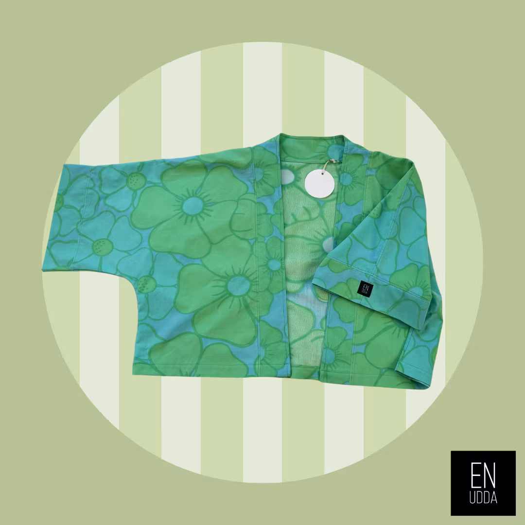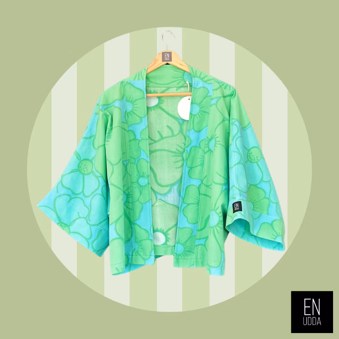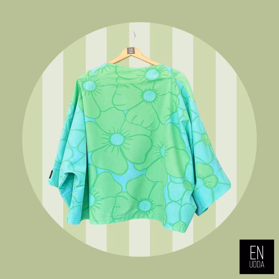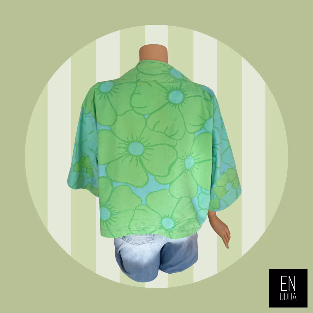 Denna är sydd i ett härligt storblommigt turkose/grönt retrotyg. En gång i tiden så har detta tyg varit påslakan och det gör sig så snyggt till detta plagg.