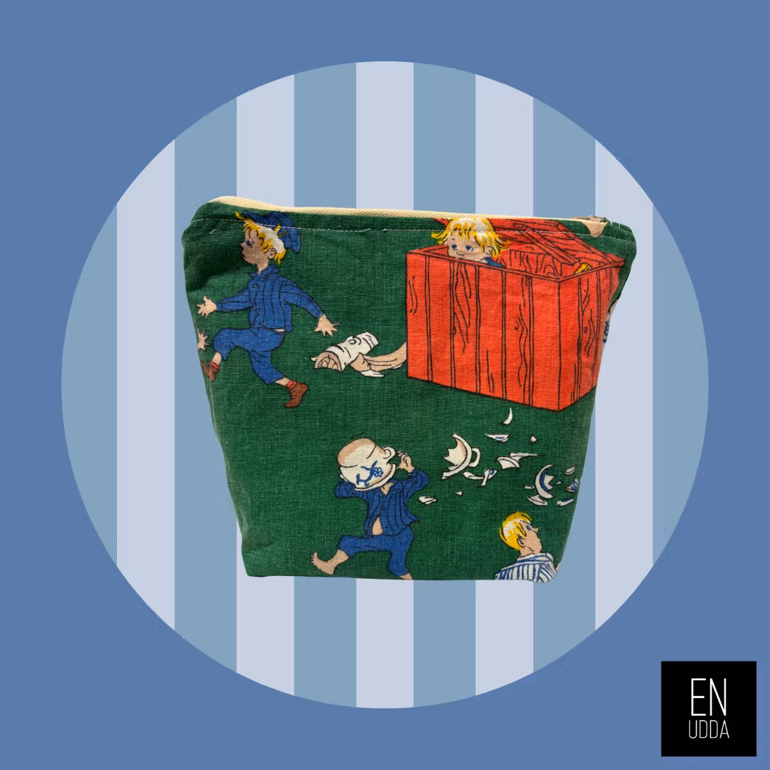 Tillverkad av underbara 70-talstyget Emil i Lönneberga med mörkgrön botten. Innertyget är grön/vit rutigt.