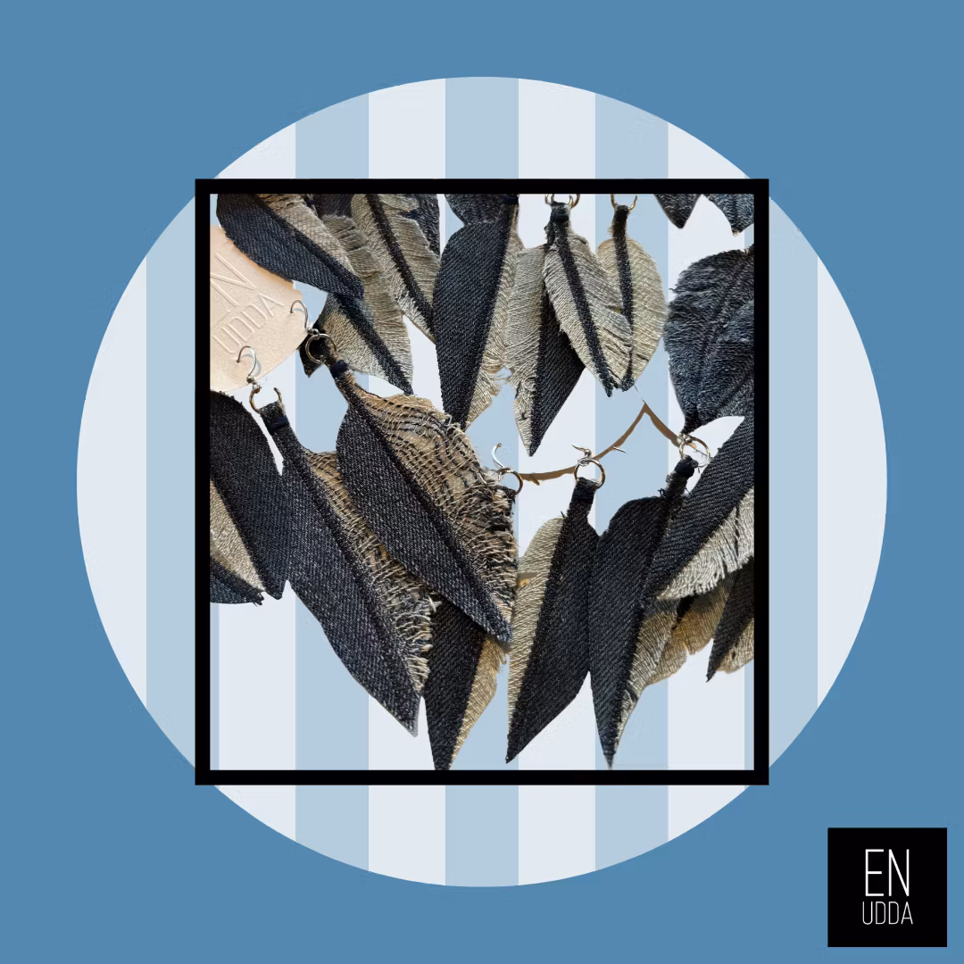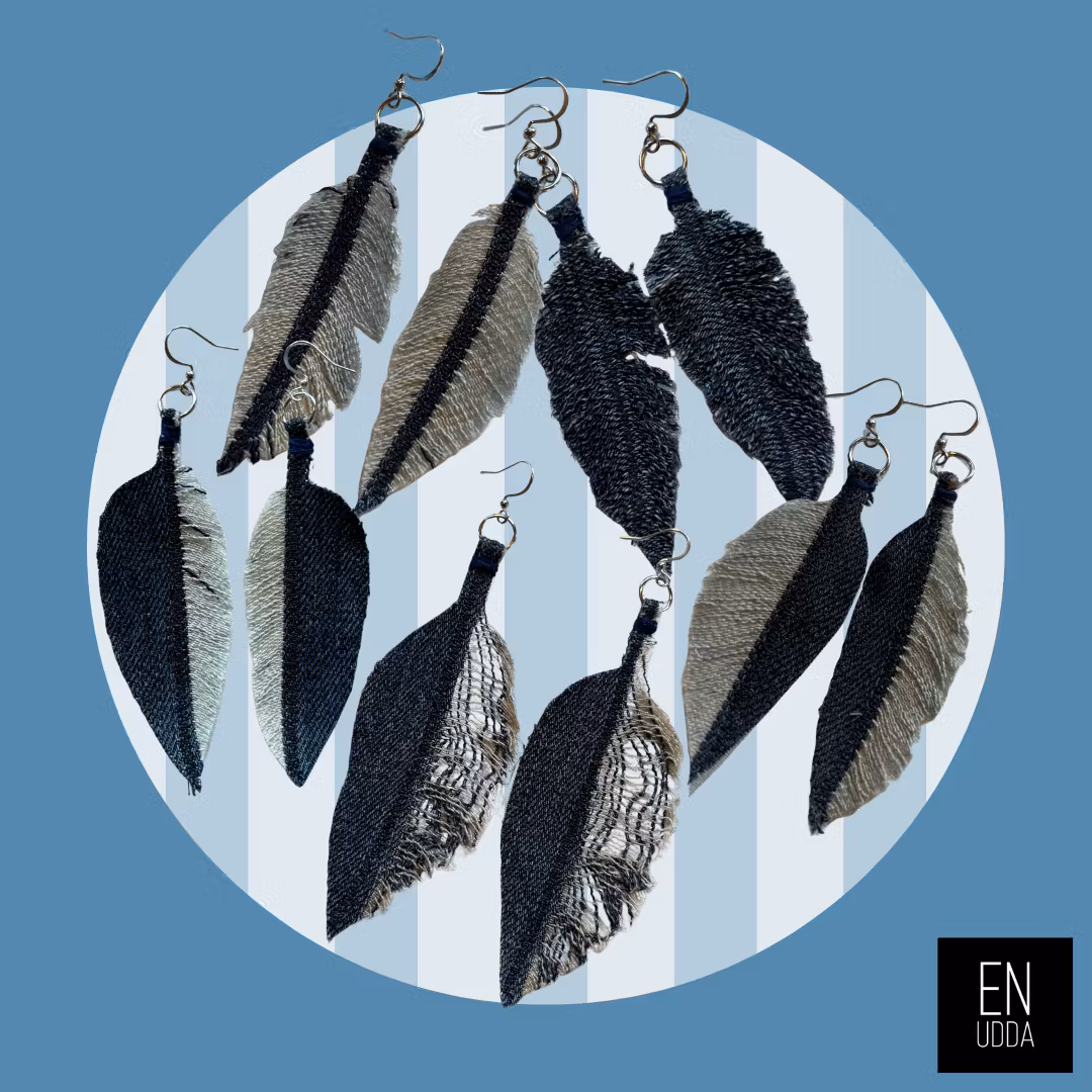 Handgjorda "Fjäder" örhängen av jeanstyg. Återbruk, recycle, slowfashion, hållbart mode, klimatsmart.